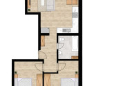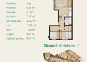 Tento 3-izbový byt disponuje vstupnou chodbou, obývačkou voľne prepojenou s kuchyňou, loggiou z obývačky, kúpeľňou s WC a dvoma spálňami. Výmera bytu je 74,8 m2, z toho 9,6 m2 tvorí loggia a nachádza sa na 1 poschodí.