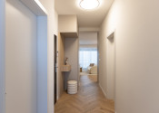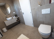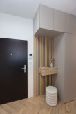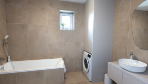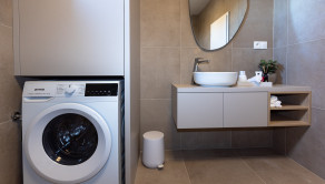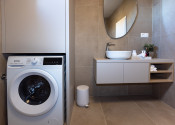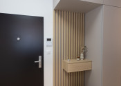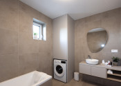 Kúpeľňa je vybavená taktiež nábytkom na mieru - skrinka pod umývadlom a skrinka na zabudovanie bojleru s úložným priestorom a priestorom pre práčku, ktorá je súčasťou bytu.