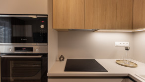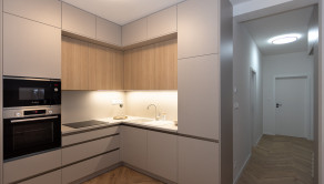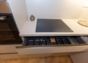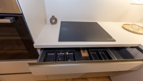 Vysokokvalitná kuchynská linka na mieru je rozdelená do dvoch sektorov, rohová časť s elektrickými spotrebičmi a drezom a časť s dodatočným úložným pristorom a pracovnou plochou na prípravu nápojov a jedla. Súčasťou linky sú zabudované elektrické spotrebiče - chladnička s mrazničkou, el. rúra, mikrovlnka, umývačka riadu a el. varná doska.