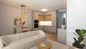 Byt je kompletne na mieru zariadený a vybavený, a tak umožňuje budúcemu majiteľovi pohodlné bývanie ihneď po kúpe. Byt disponuje elektrickými hliníkovými žalúziami na všetkých oknách, klimatizáciou, kvalitnou drevo-laminátovou podlahou, kuchynskou linkou, šatníkovou skriňou a ďalšími nábytkami vyhotovenými na mieru na chodbe, v obývačke a v kúpeľni.