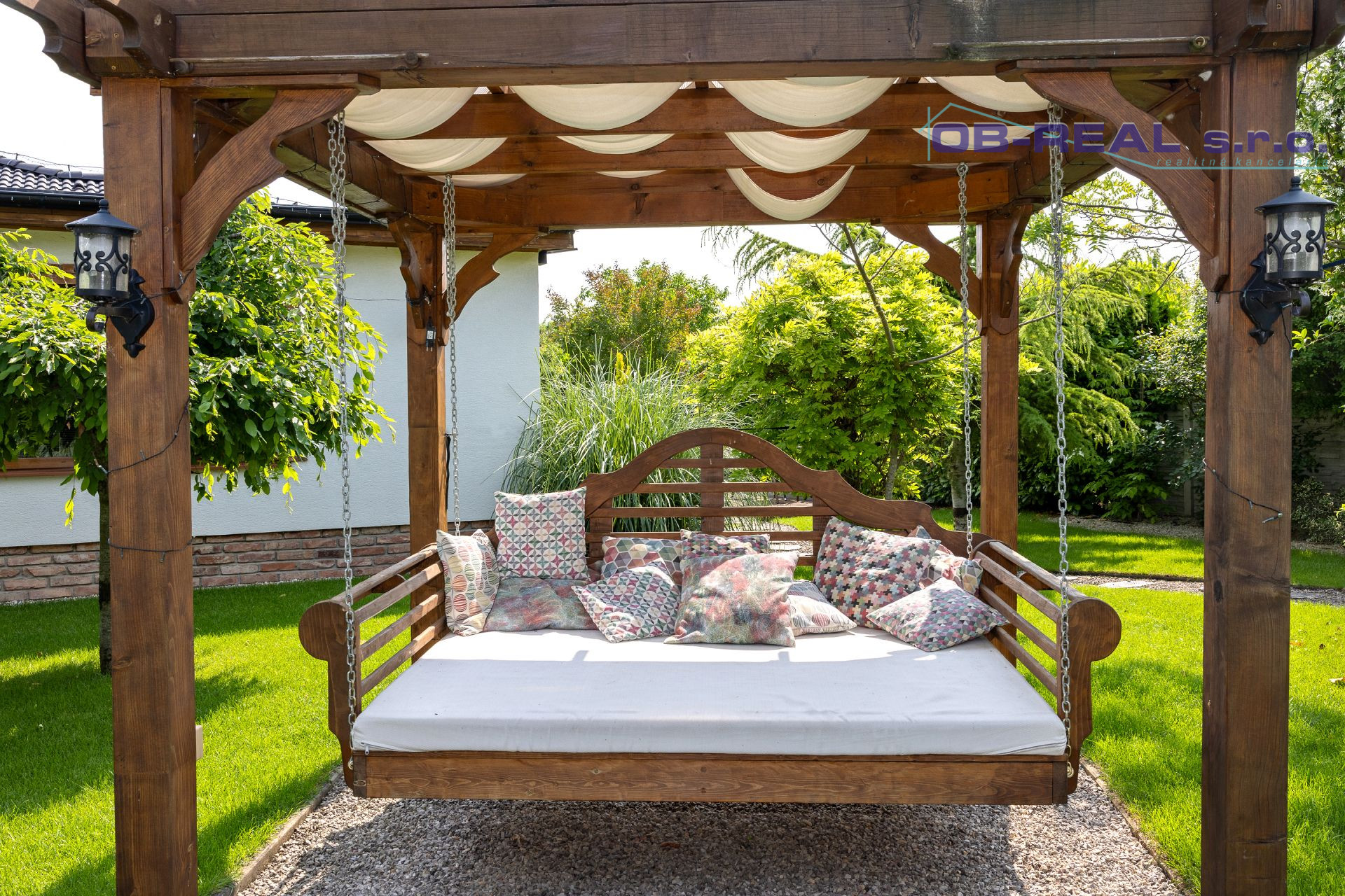 Na dvore pred domom levitujúca drevená posteľ, lavička z dreveného masívu.