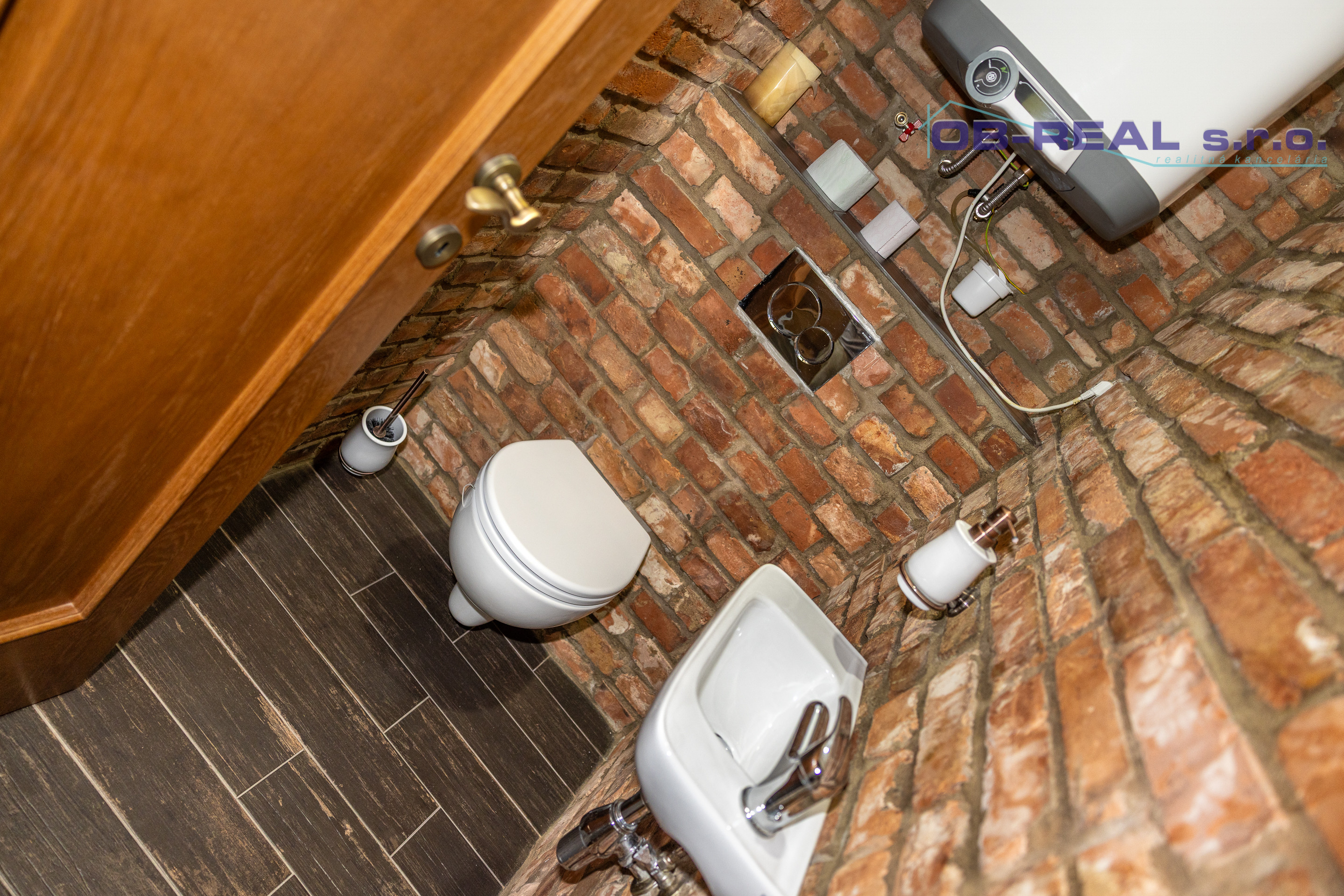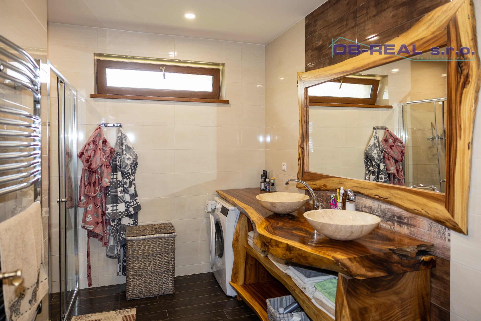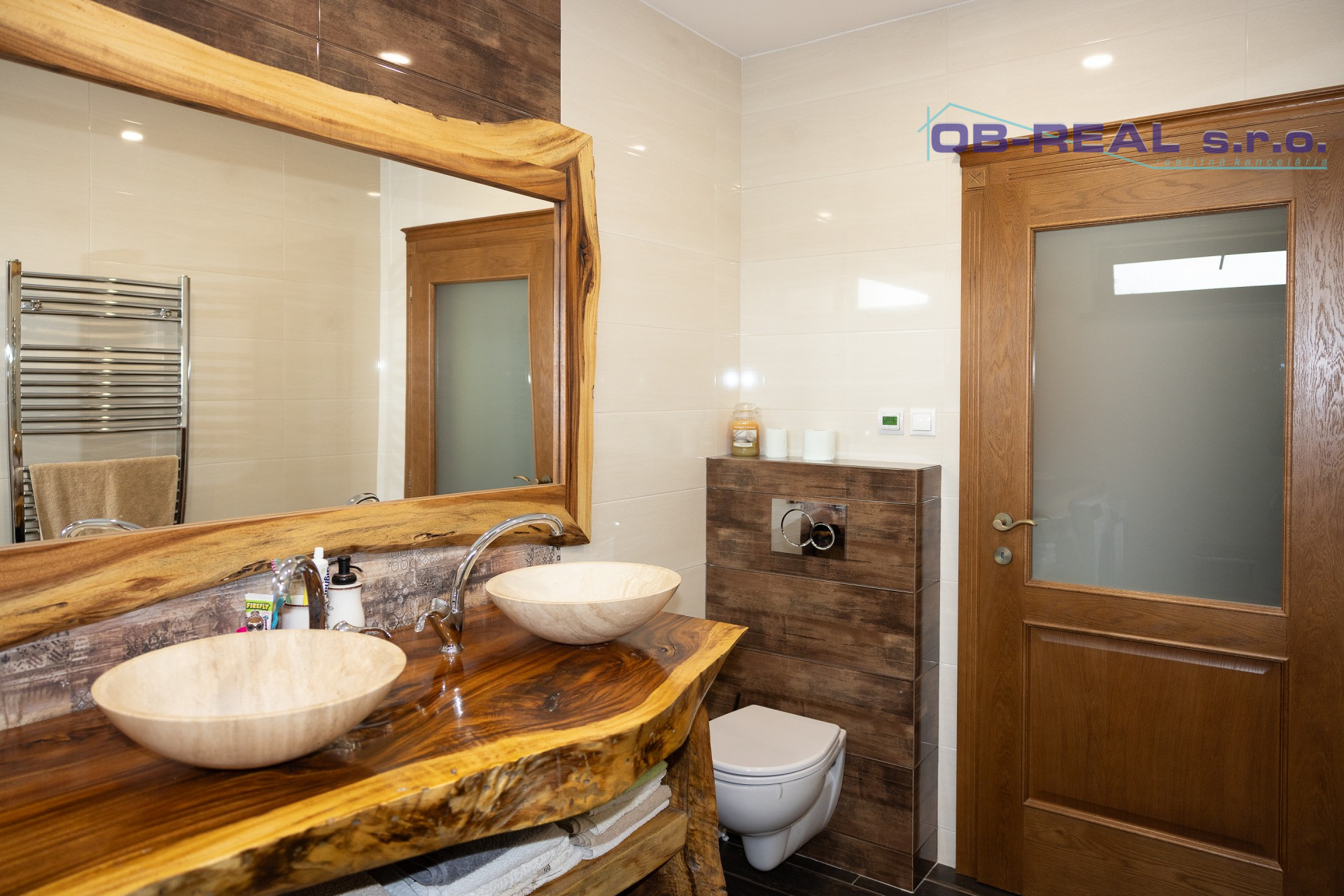 V kúpeľni WC, 2x umývadlo osadené na pulte z dreveného masívu, sprchovací kút.