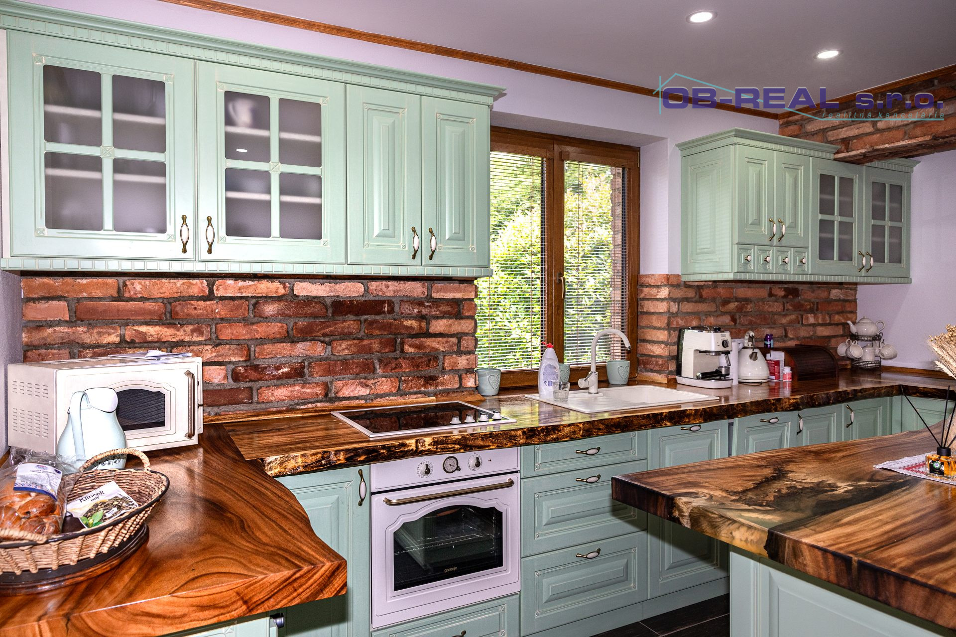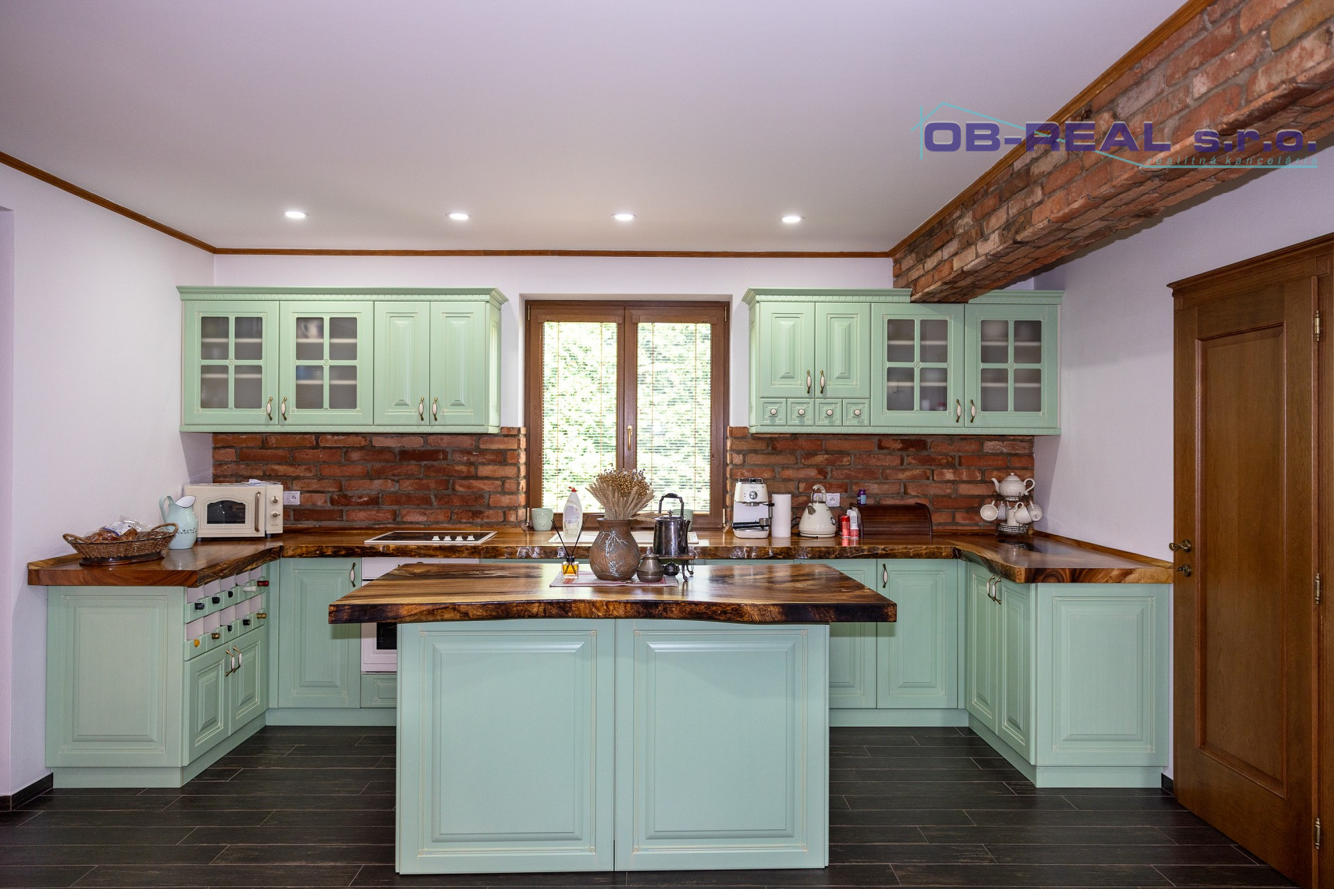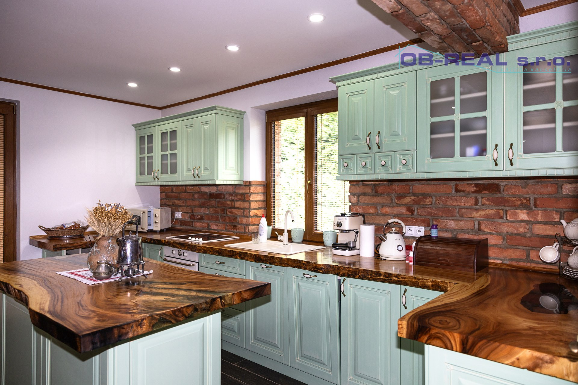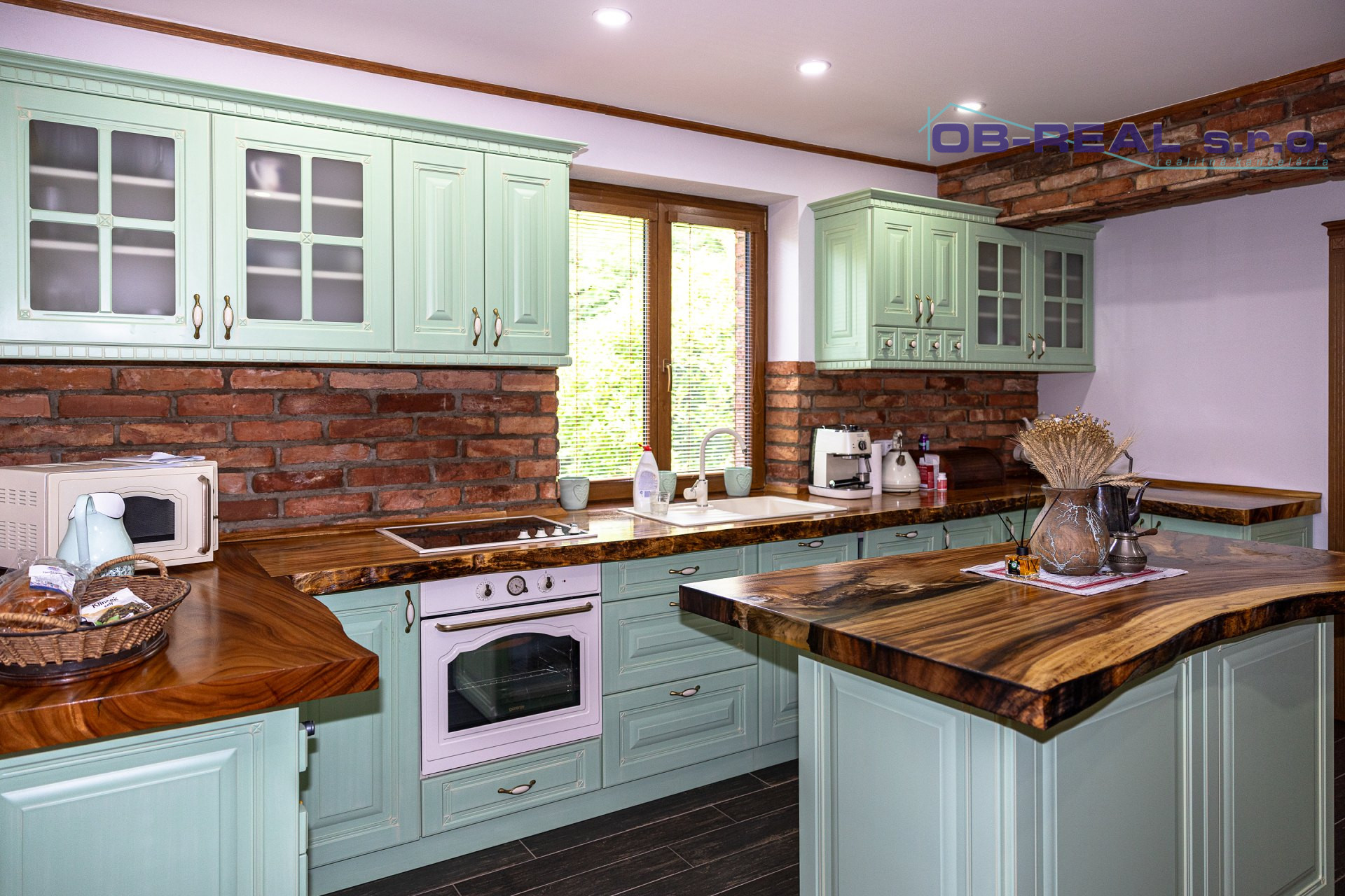 V kuchyni linka na mieru s pracovnou doskou z dreveného masívu a zabudovanými spotrebičmi (sklokeramický varný panel, elektrická rúra, umývačka riadu).