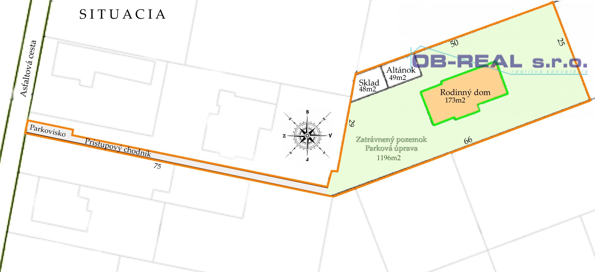 Pozemok 1570m2; šírka 25m, dĺžka 66m.