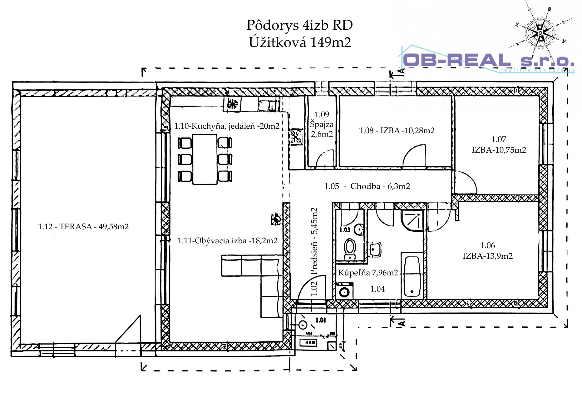 Dom: zastavaná plocha 173m2; úžitková 149m2 (v tom 49m2 prestrešená obstavaná terasa)