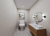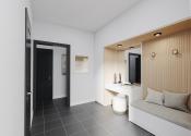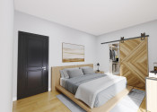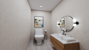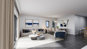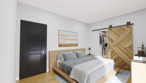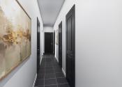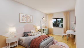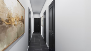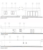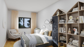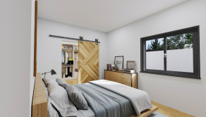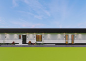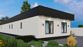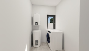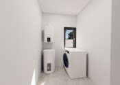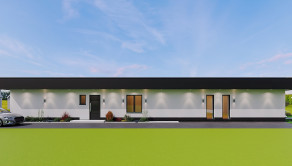 Dispozícia: Vstup do domu je z bočnej strany, zo závetria do predsiene odkiaľ je voľný prechod na chodbu, z ktorej je vstup do všetkých ostatných miestností: 2x WC, kúpeľňa, technická miestnosť, špajza, 2x detská izba, spálňa rodičov s nadväzujúcou šatníkovou miestnosťou, kuchyňa voľne prepojená s jedálňou a obývačkou. Z obývačky je vstup na terasu.