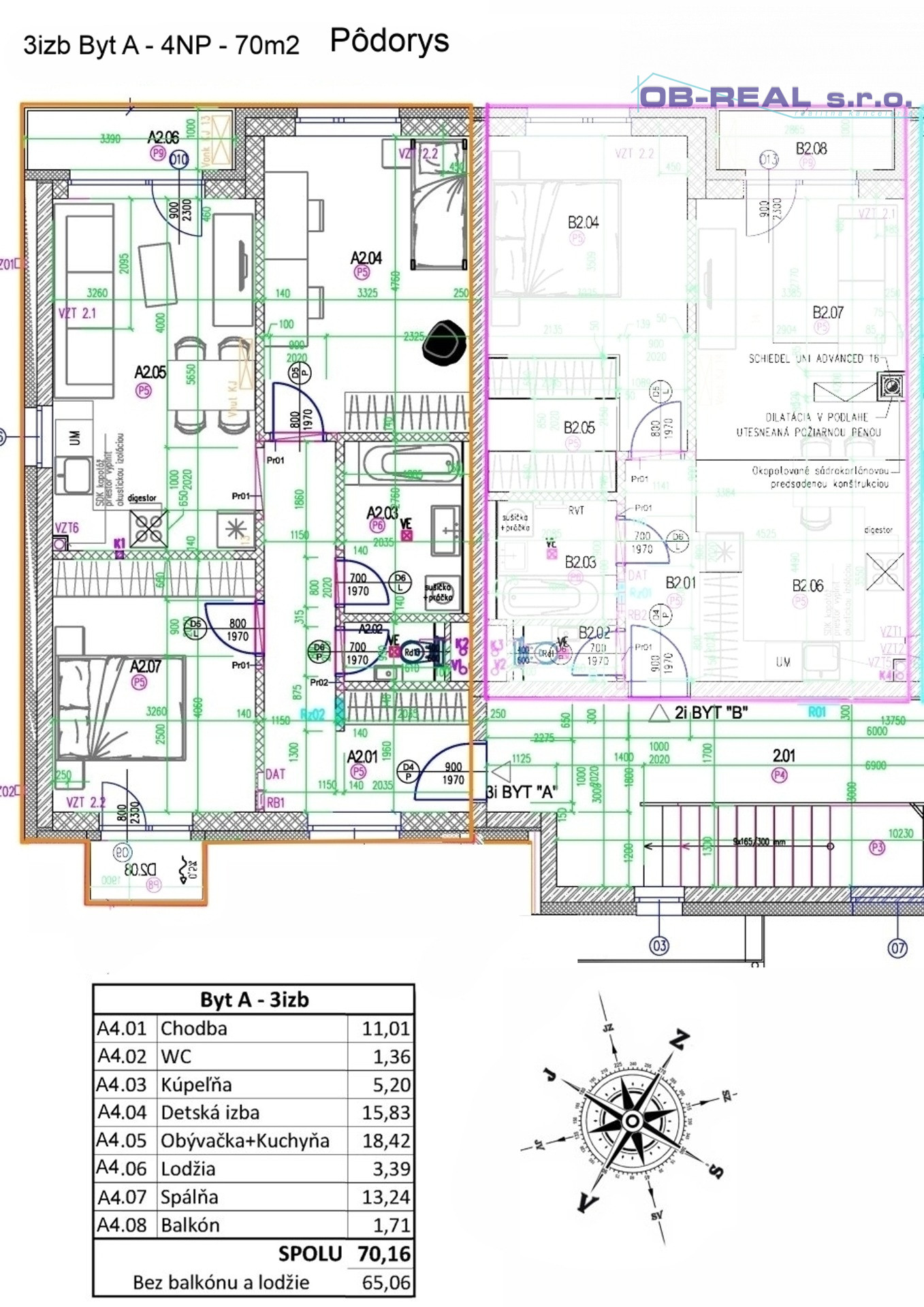 Úžitková plocha bytu je 70,16m2 (bez lodžie a balkóna 65,06m2)