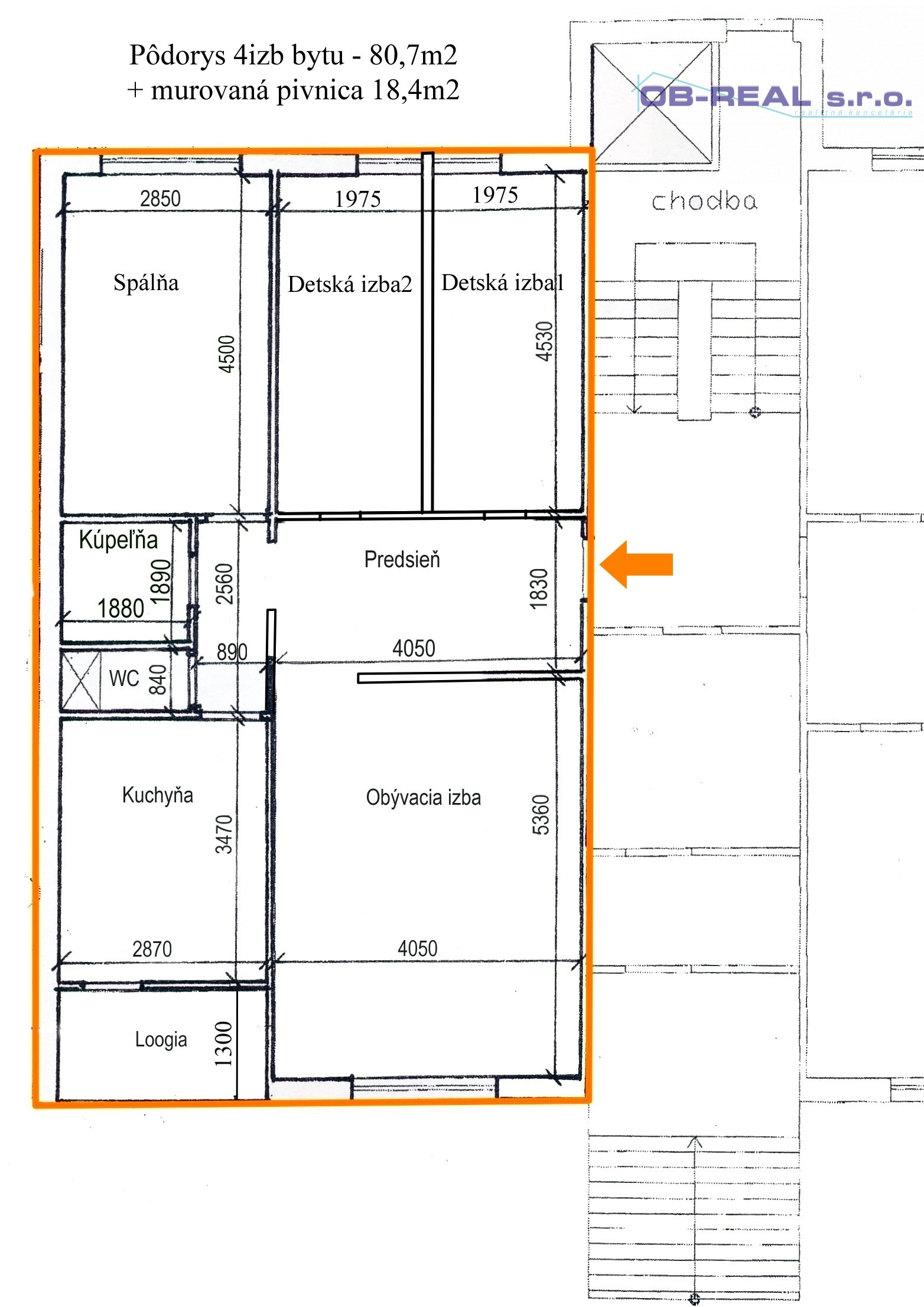 Orientácia bytu: 3x izba severozápad, obývačka a loggia z kuchyne juhovýchod.