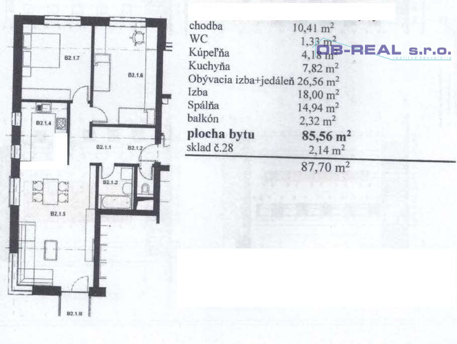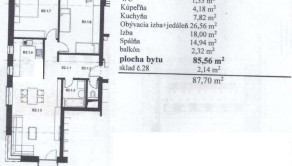Byt má výbornú DISPOZÍCIU, je pripravený ihneď po kúpe na nasťahovanie. Zo vstupnej chodby s veľkou zabudovanou šatníkovou skriňou je prístup do kúpeľne so sprchovým kútom a vaňou a do samostatného WC a ďalej do obývačky, z ktorej je výstup na balkón. Obývačka je voľne prepojená s jedálňou a kuchyňou a je výborne presvetlená niekoľkými oknami s orientáciou na 2 svetové strany - východ a juh. Byt disponuje dvomi priestrannými spálňami, ktoré su nepriechodné a sú orientované na západ. K bytu prislúcha kobka (sklad) umiestnený hneď vedľa bytu.