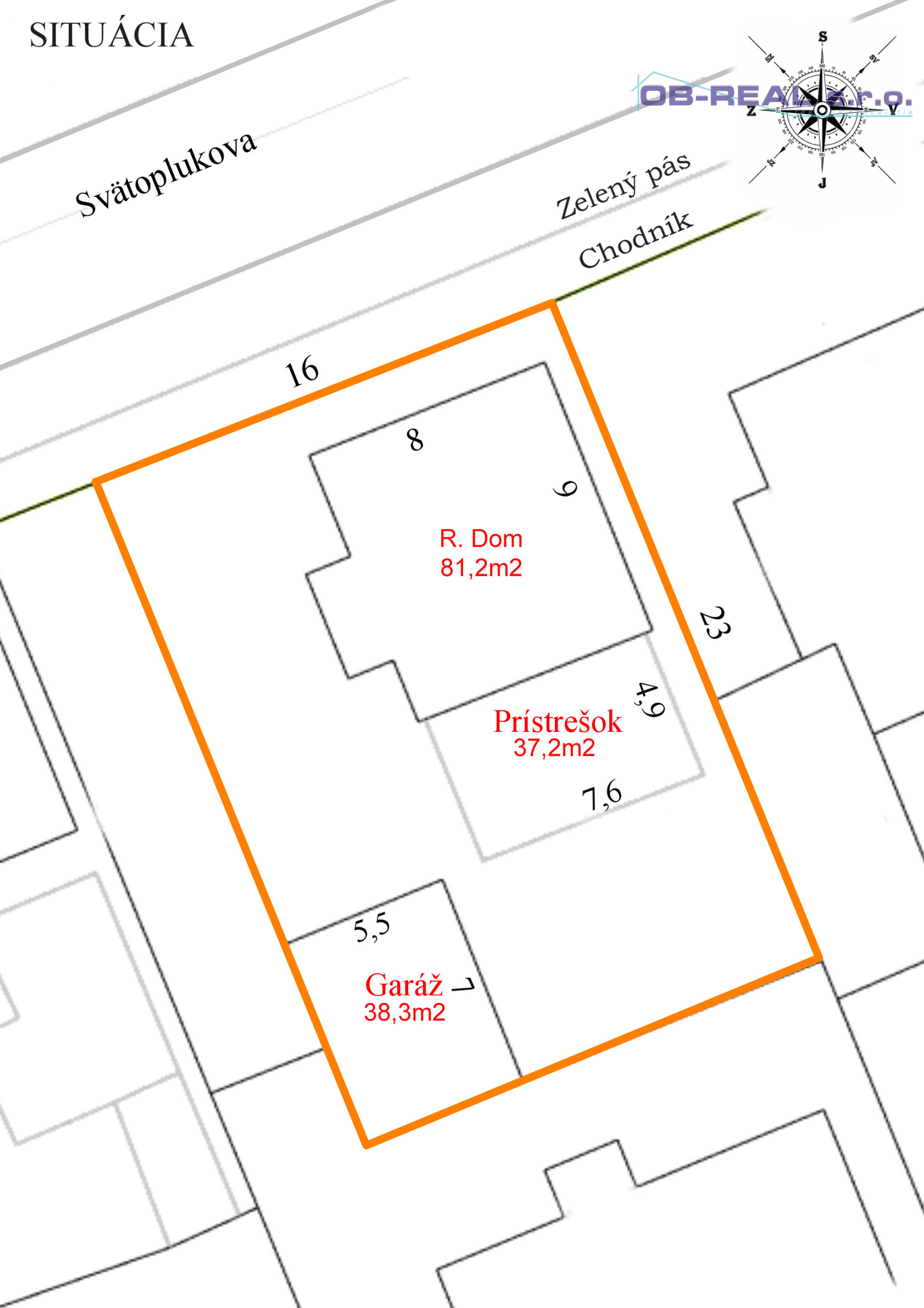Orientácia: Juhovýchod (terasa), severozápad (čelo domu do ulice).