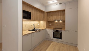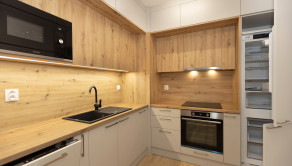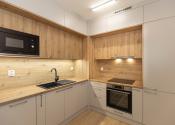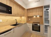 Vybavenie kuchyne: kuchynská linka, el. rúra, sklokeramický varný panel, digestor, mikrovlnka, umývačka riadu, chladnička, mraznička.