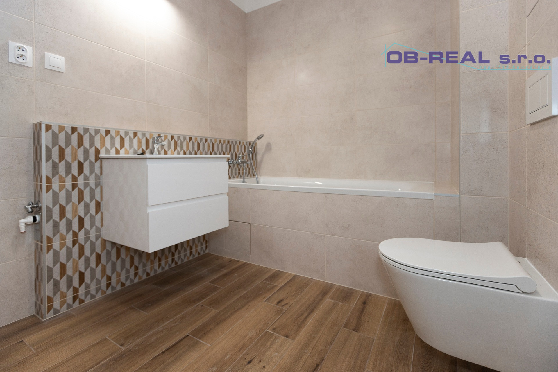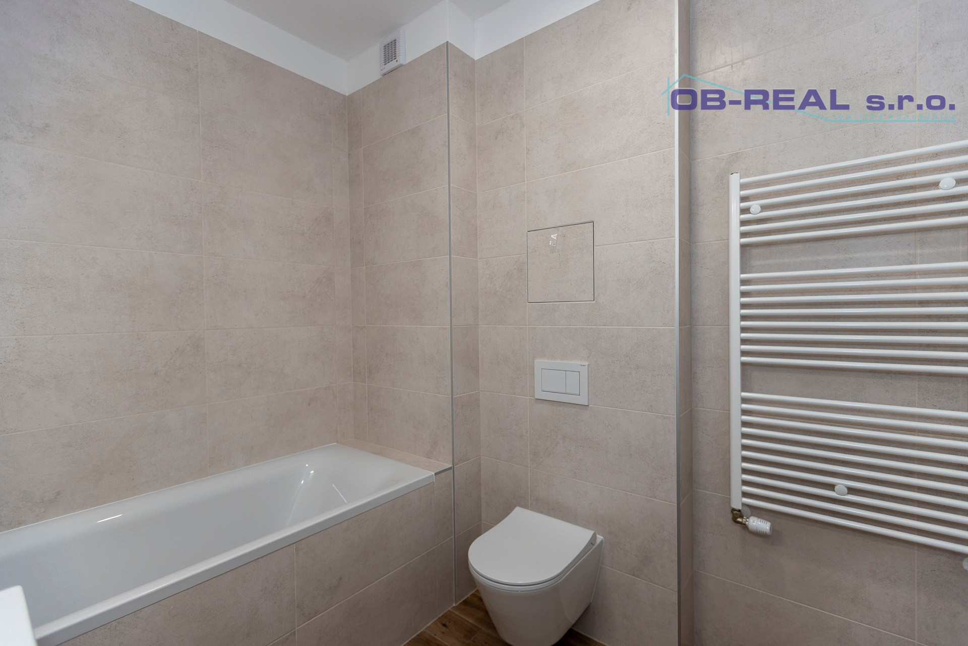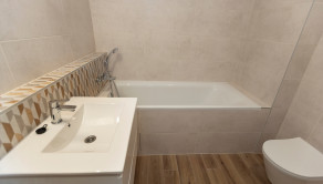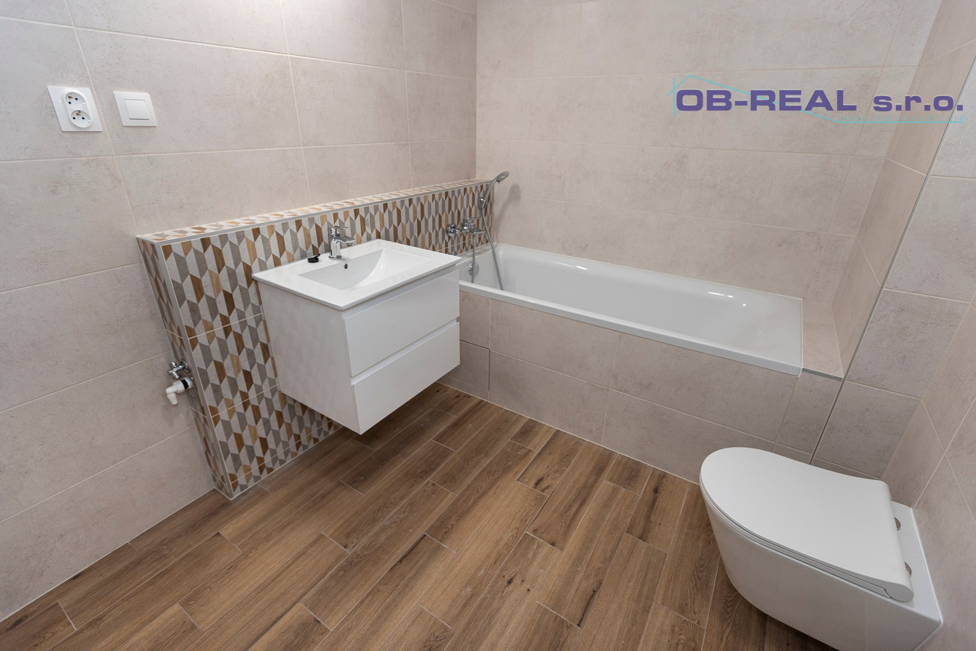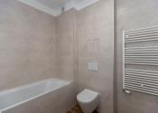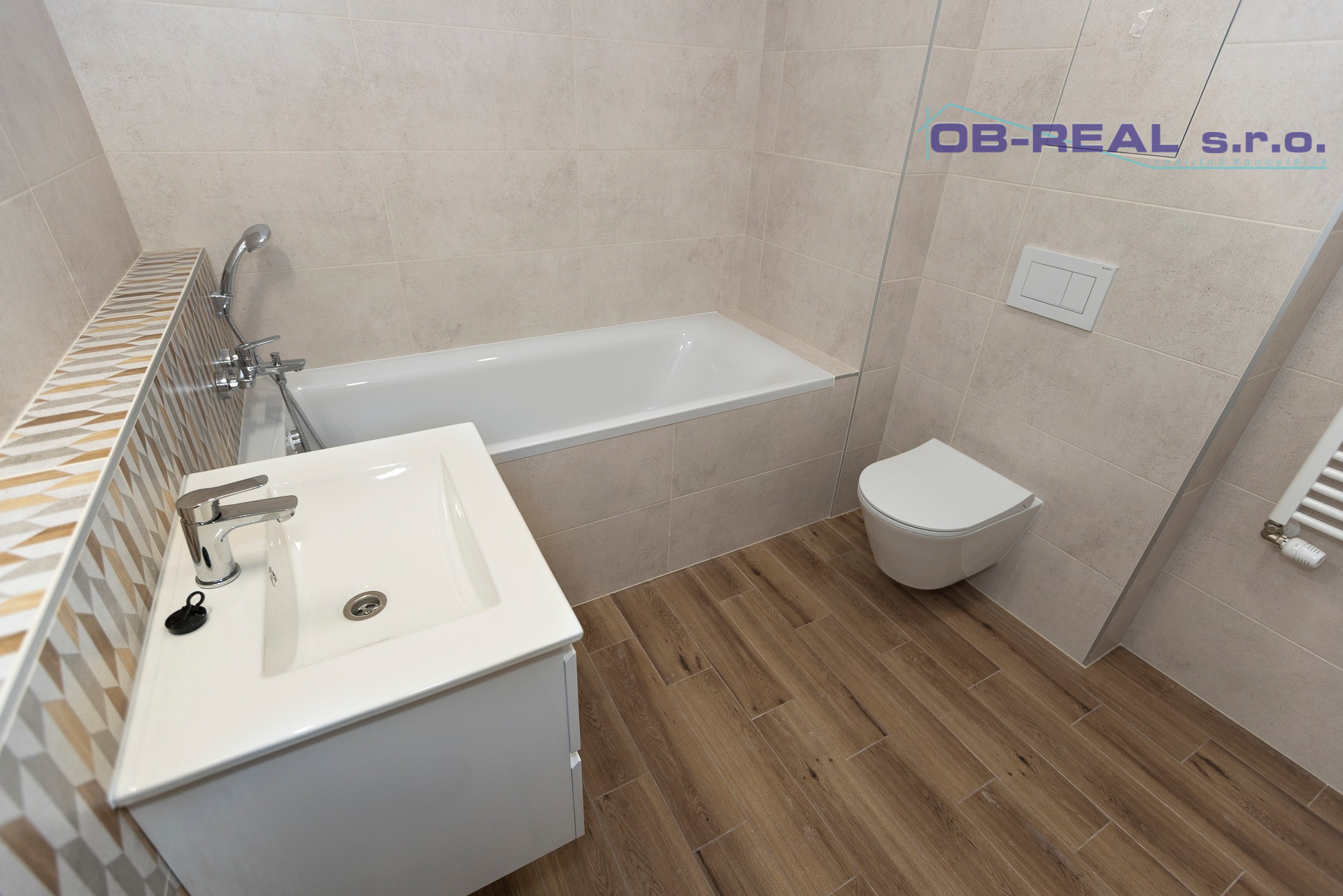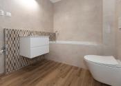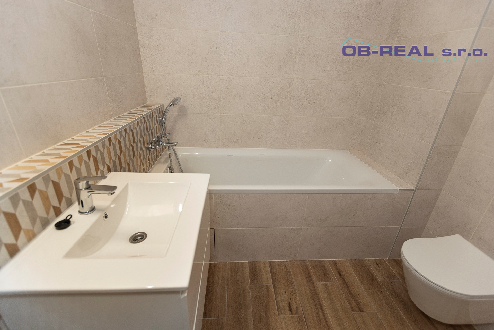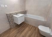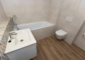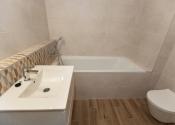 Vybavenie kúpeľne: Vaňa, umývadlo zapustené v skrinke, WC, rebrinový radiátor.