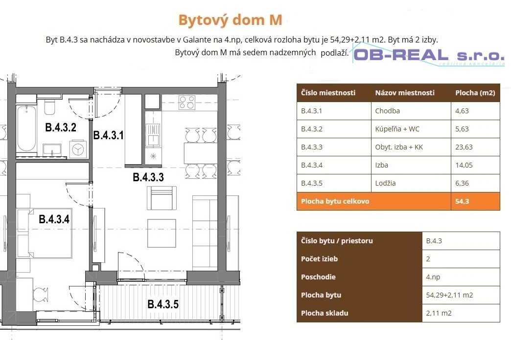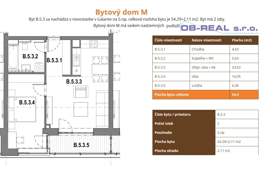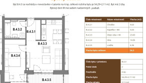 Plocha: úžitková 54,29m2 + sklad 2,11m2.