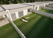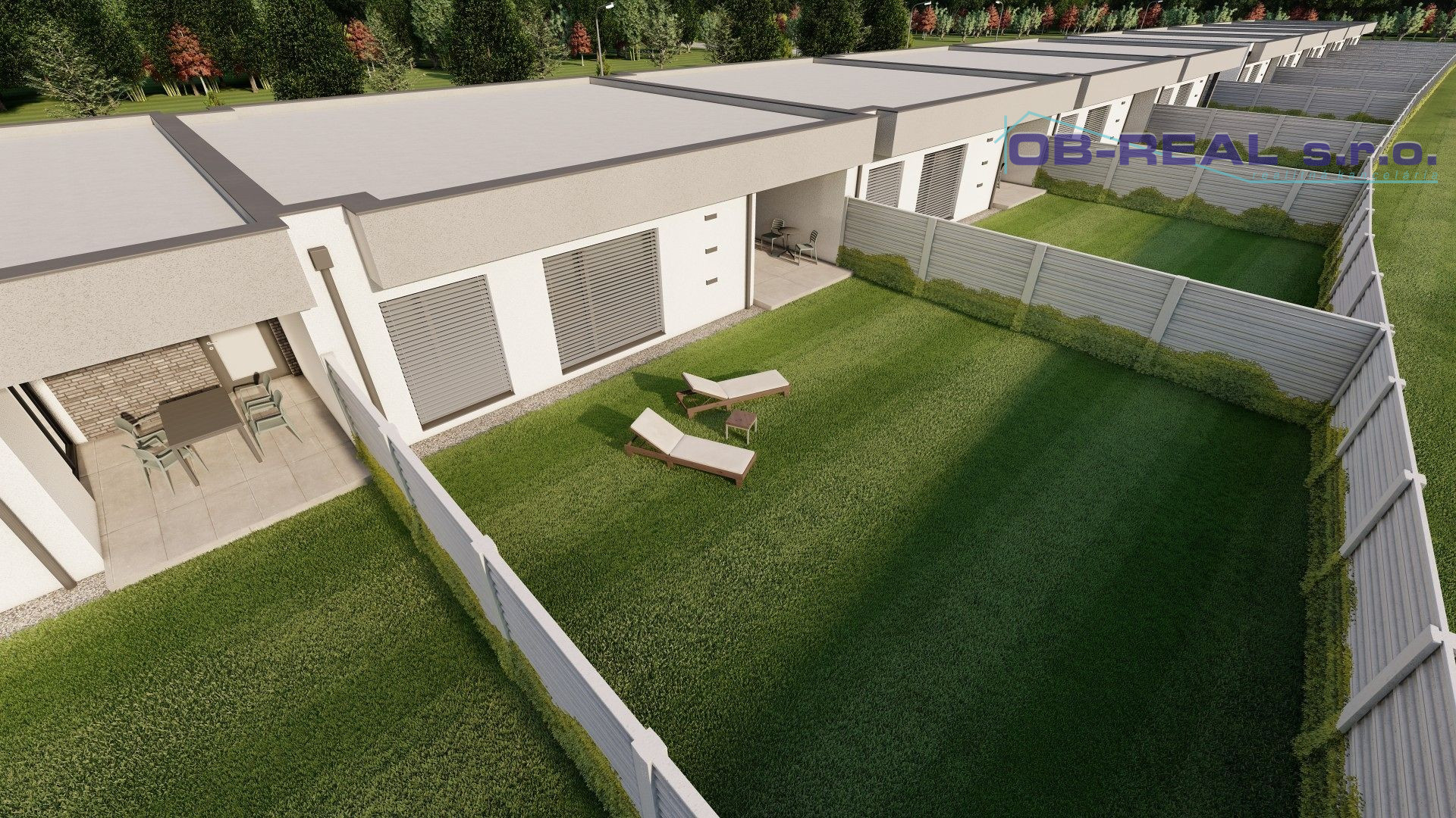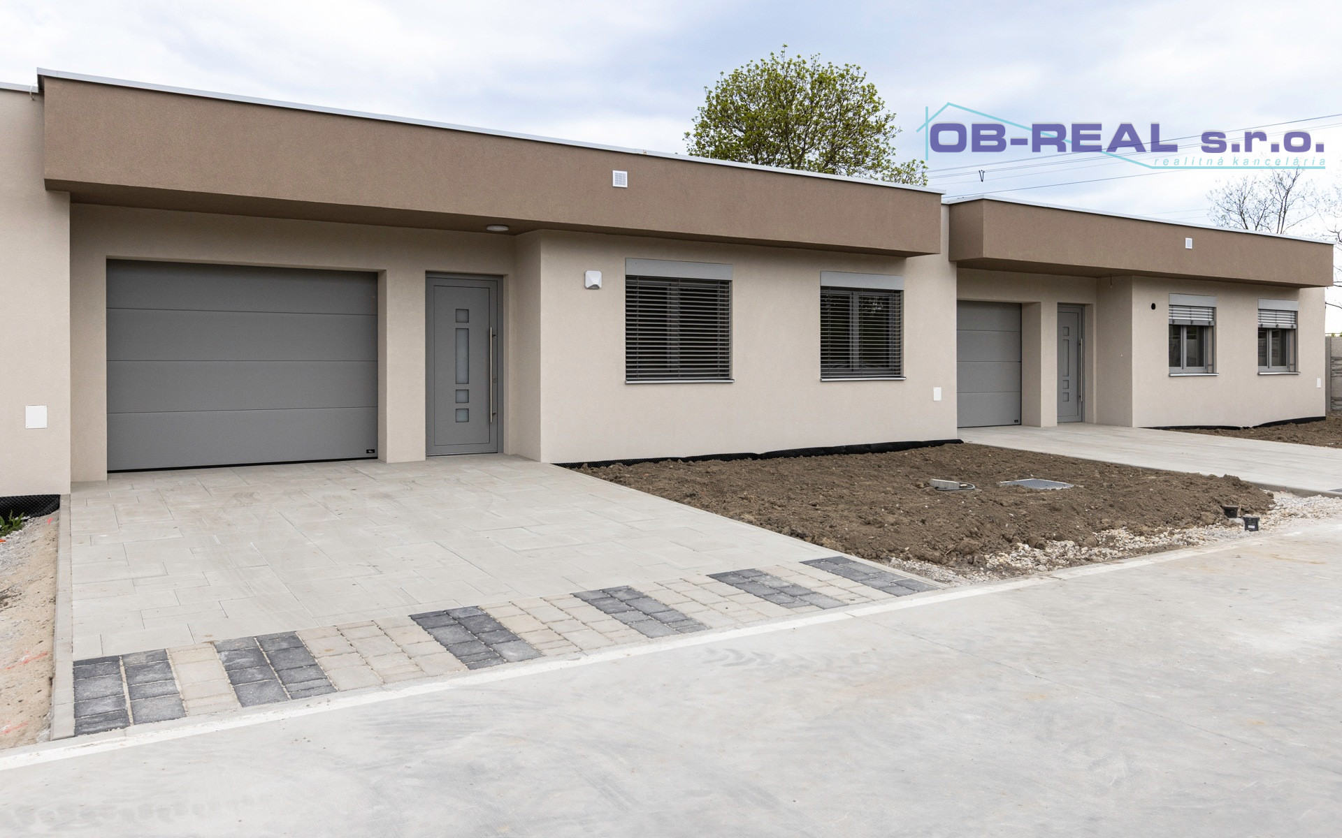 Predná časť pozemku je voľne prístupná s parkovaním zo zámkovej dlažby pre dve osobné autá. Zadná časť pozemku bude uzatvorená, oplotená bariérovým plotom. Veľmi poteší aj v zlom počasí vstup do garáže cez elektronickú bránu a odtiaľ suchou nohou prechod do obytnej časti domu. Z garáže je tiež východ na zadnú terasu.