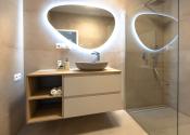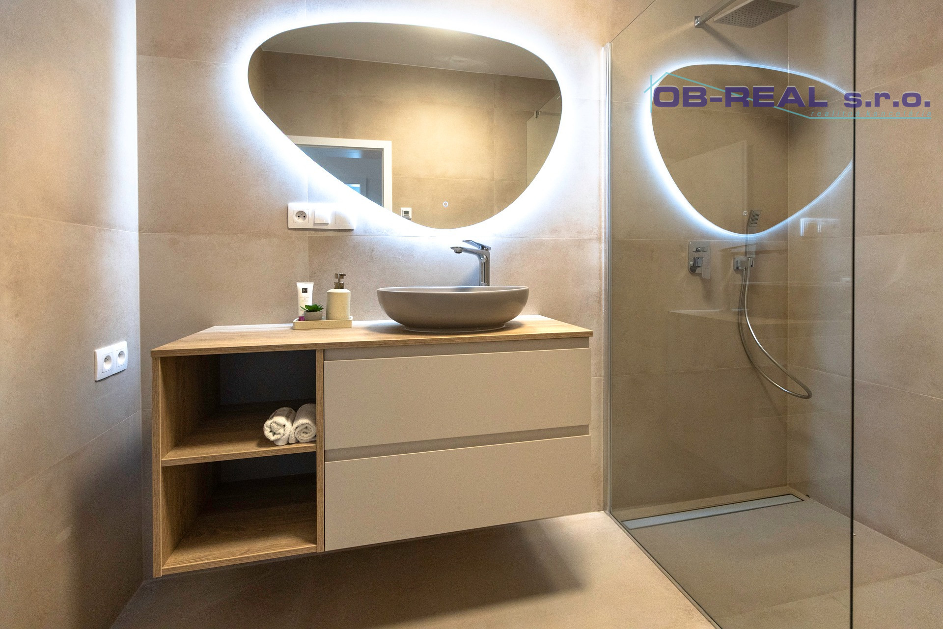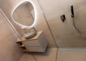 Kúpeľňa: Skrinka s umývadlom, nástenné zrkadlo, sprchovací kút.