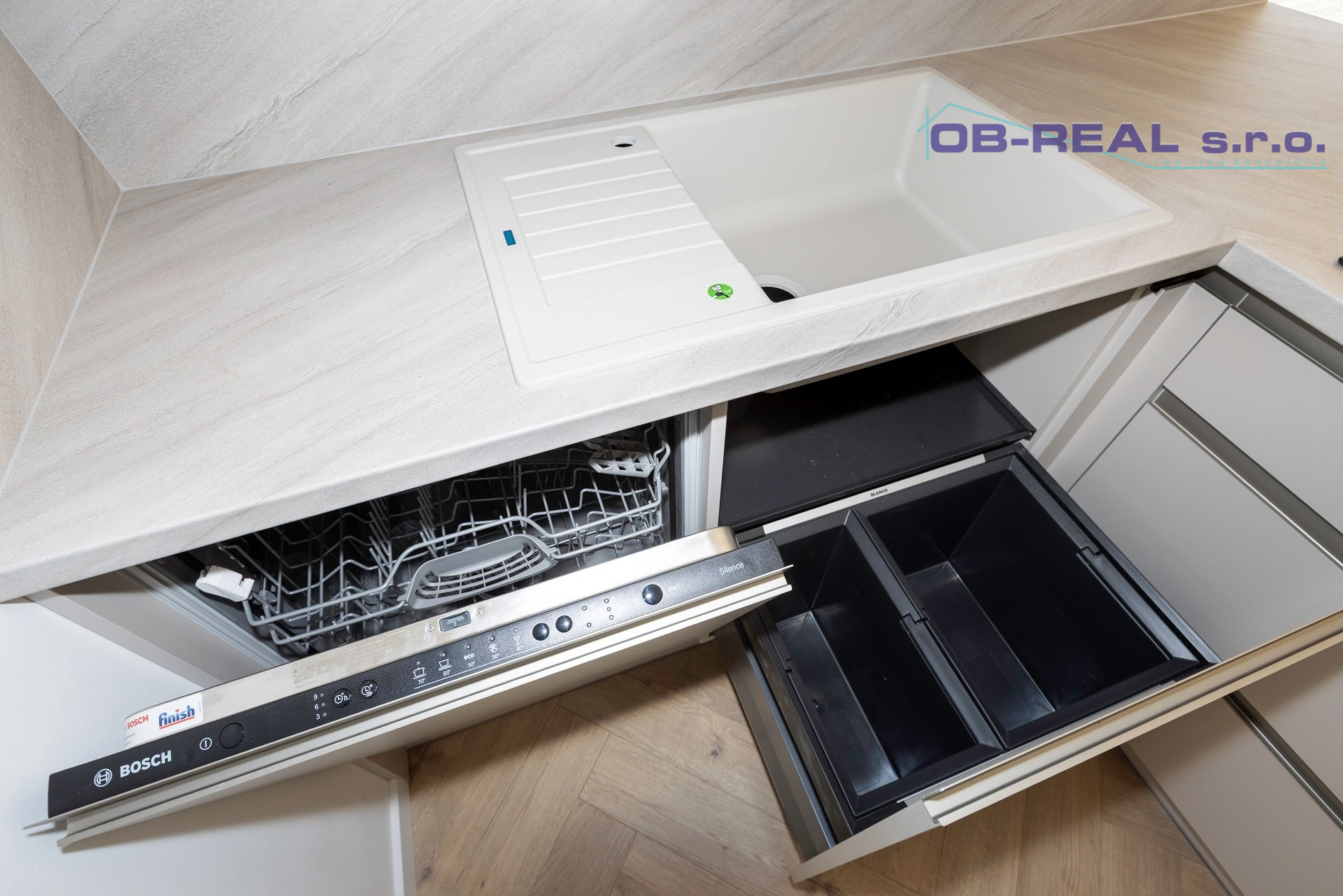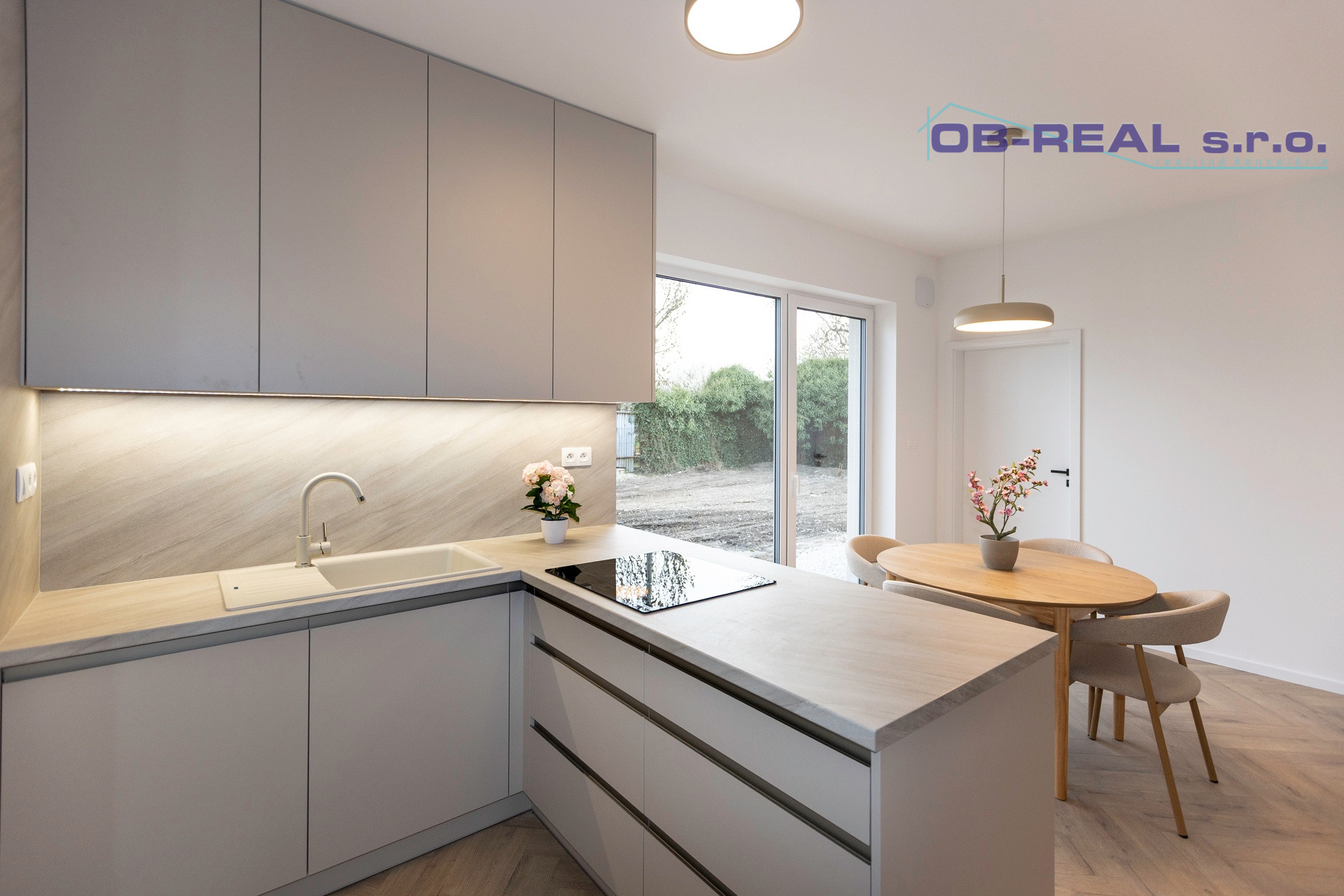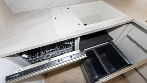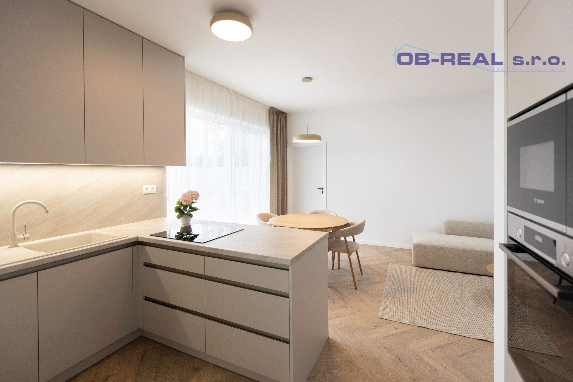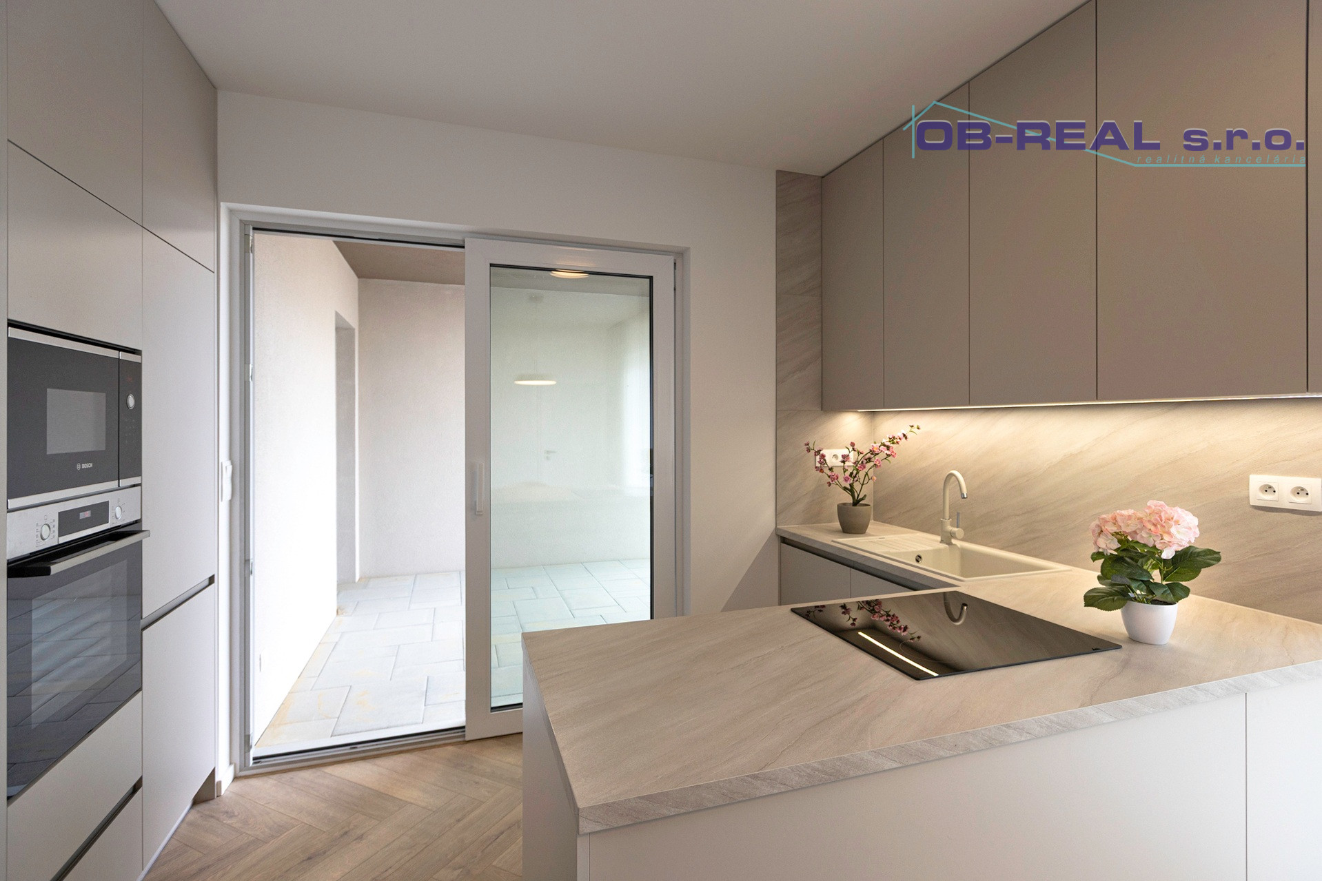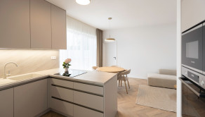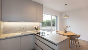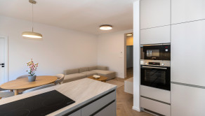 Kuchyňa: Kuchynská linka na mieru so spotrebičmi (elektrická teplovzdušná rúra, mikrovlnka, Chladnička, mraznička, sklokeramický varný panel, umývačka riadu, led podsvietenie pracovnej plochy).